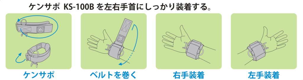 ケンサポは、重い荷物を持つ際にかかる手や指への負担を、手首と腕全体に分散させる画期的なサポーターです。